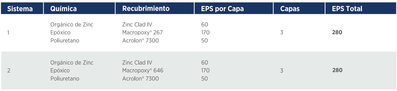Los sistemas de recubrimiento que forman parte del portafolio ISO-12944 de Sherwin-Williams se detallan en el siguiente conjunto de tablas. Cuando estos sistemas no estén disponibles en una región, por favor contacte a un representante Protective & Marine de Sherwin-Williams.