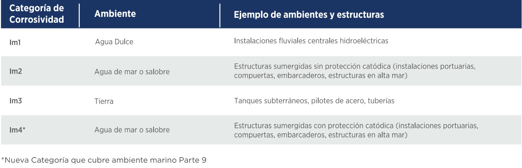 También se agregó una cuarta categoría de inmersión, IM4, que cubre estructuras sumergidas en agua de mar o salobre, que están protegidos por protección catódica.